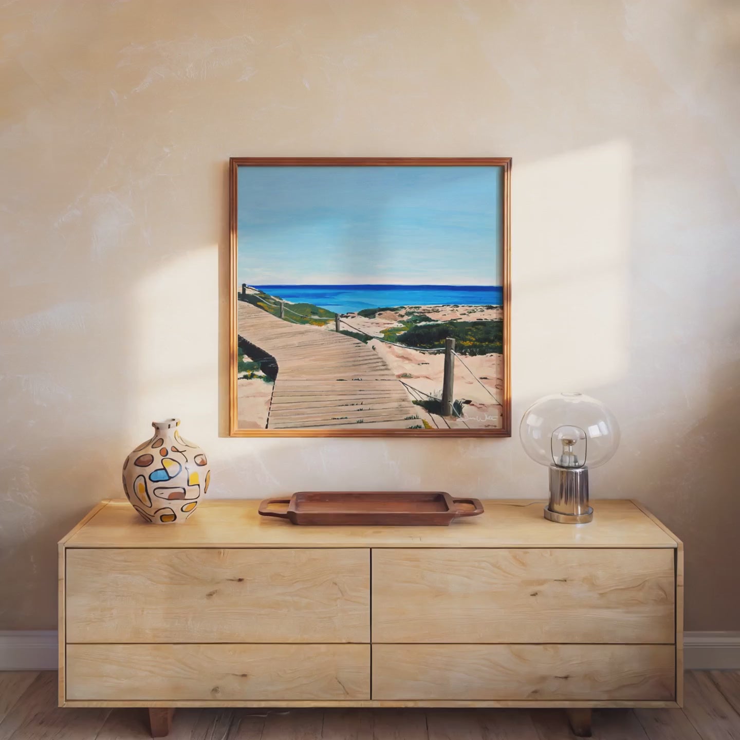 Immerse yourself in the serene natural scenery of the Spanish island of Formentera with this seascape painting. The wooden boardwalk winding through the sandy dunes leads the eye to the stunning turquoise waters of the Mediterranean.