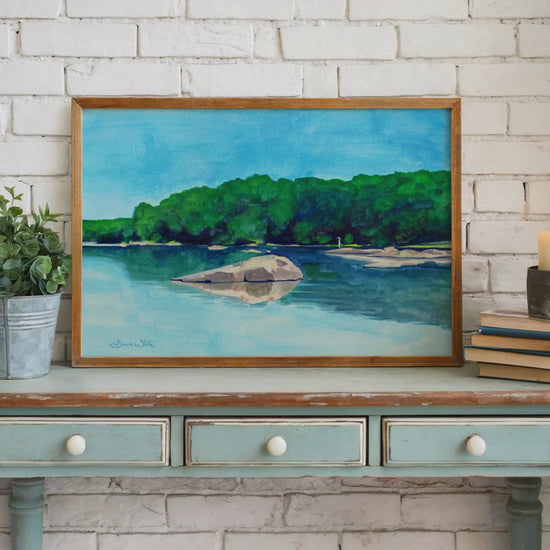 Decorate your space with this peaceful watercolor art of the Potomac River on a sunny summer day, with a great blue heron standing watch on a rock.