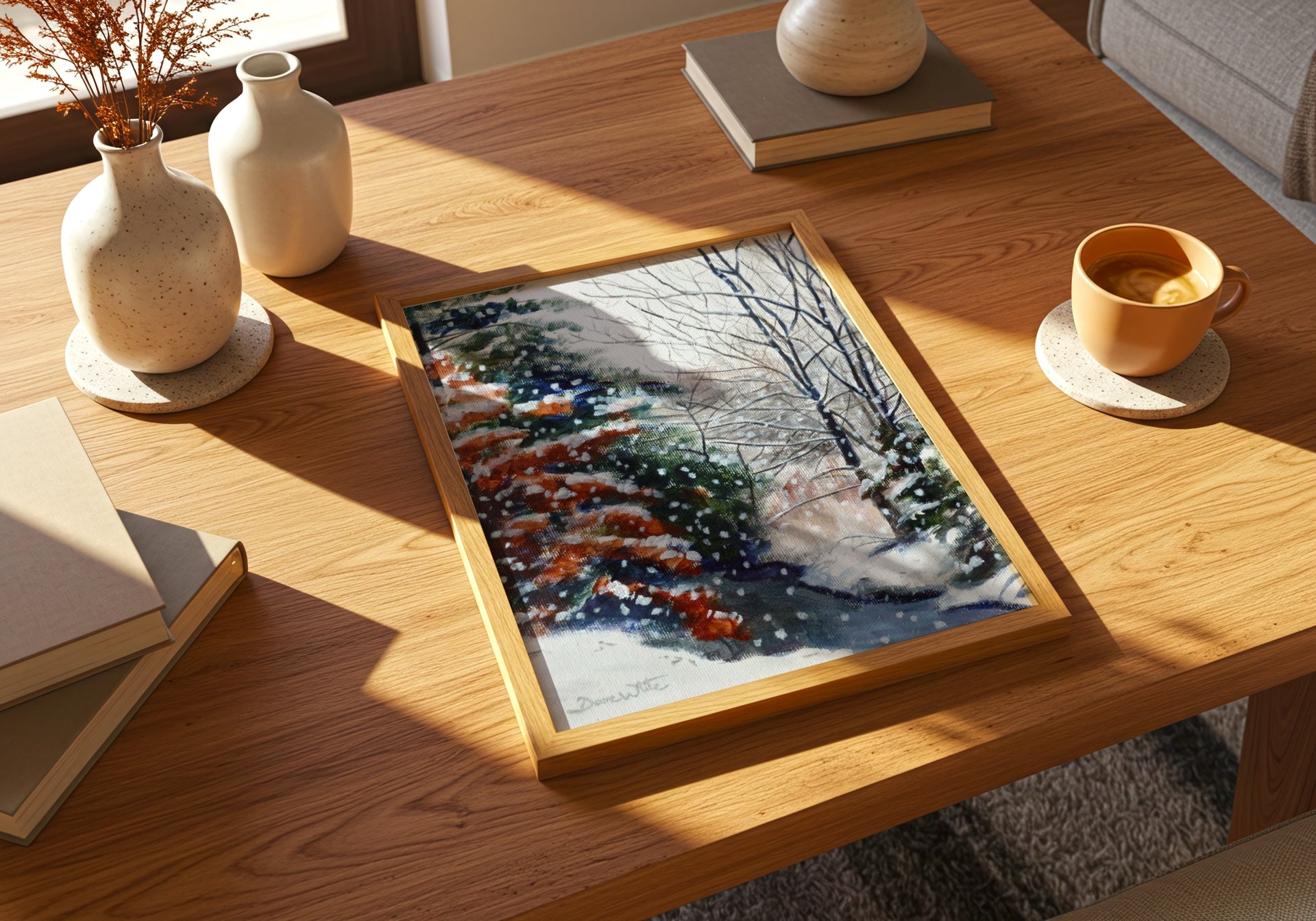 This art print is of a painting of a peaceful winter landscape, with snow falling softly in a forest, next to a small stream.